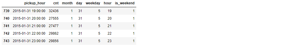 df['is_weekend'] = (df['pickup_hour'].dt.weekday // 5 == 1).astype(int)