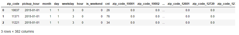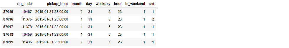 GROUP BY zip_code, pickup_hour, month, day, weekday, hour, is_weekend
