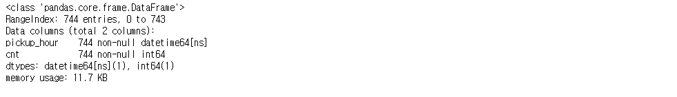 pickup_hour가 datetime64라 to_datetime을 하지 않아도 날짜 관련 데이터 추출 가능하며, 만약 다른 형태로 되어 있다면 pd.to_datetime(df['pickup_hour])로 변환해야 한다.