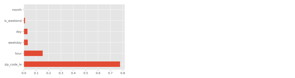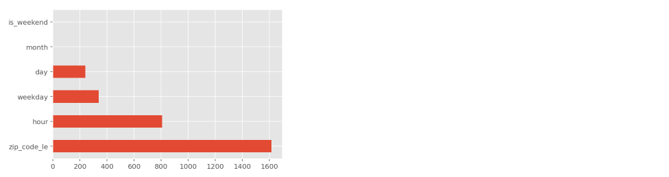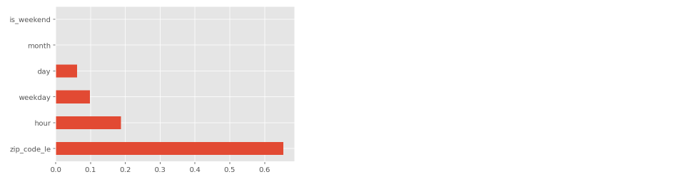 추가로 결과에 대해 Feature importance를 확인해보면, zip code가 가장 큰 영향을 미치는 것을 볼 수 있으며 이후 hour, weekday, day 순인 것을 확인할 수 있다.