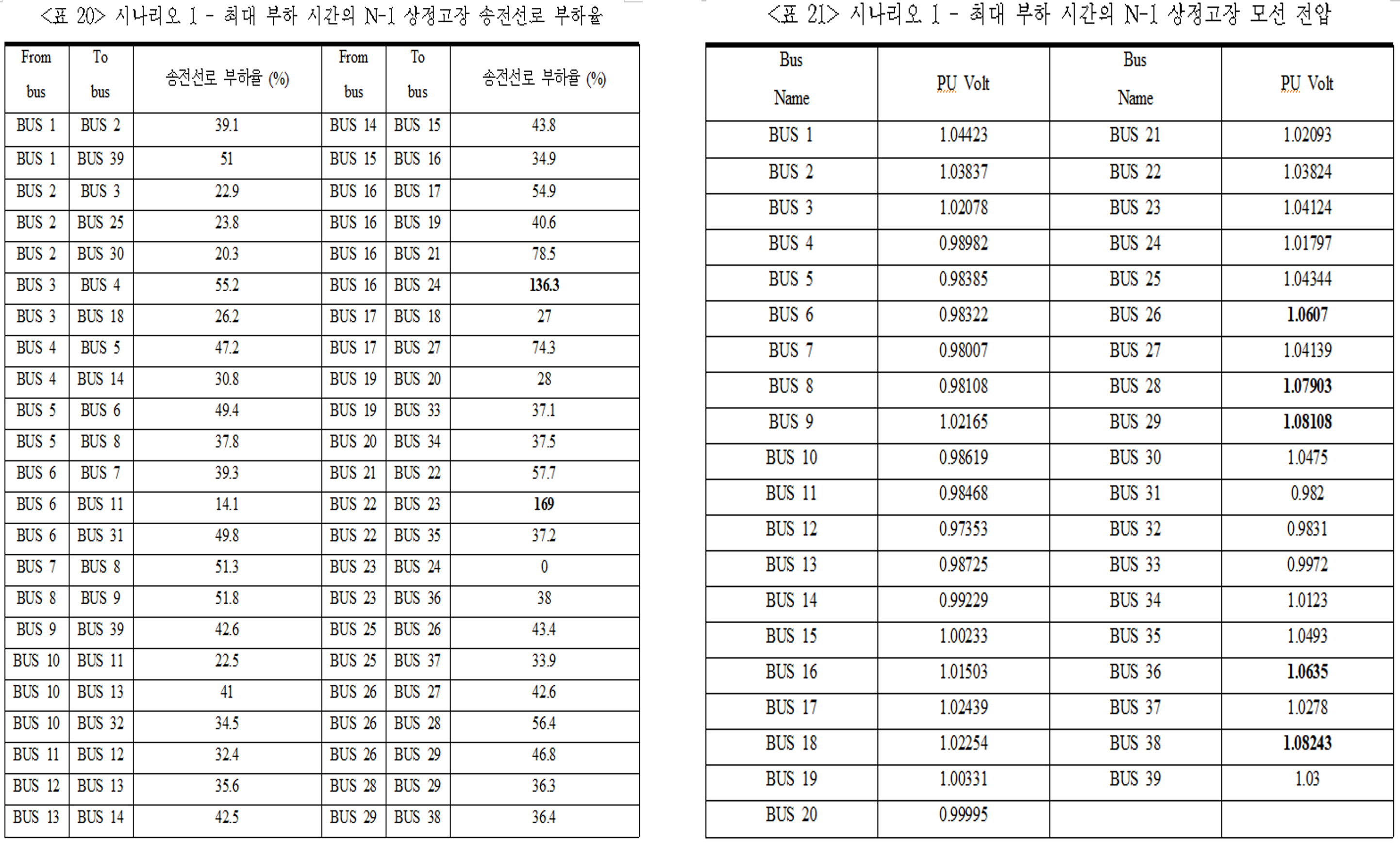 시나리오 2는 35번 버스에 전체 발전 설비의 10% 정도 되는 용량의 태양광 설비를 추가하였으며, 태양광 설비의 출력은 앞서 예측을 통해 나온 결과 중 임의로 하루를 선택하여 입력하였다. 본 연구에서는 N-1 상정고장은 다음과 같이 정의하였다.