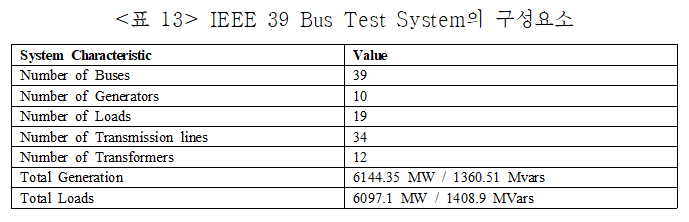 본 장에서는 출력 예측으로 얻은 값을 통해 전력계통의 송전선로 제약 영향을 검토하였다. 검토에 사용된 계통은 IEEE 39 bus system이며, IEEE 39 bus system은 전력 계통의 다양한 측면에 관한 연구에 많이 사용되는 인위적으로 만들어진 시험용 시스템이다.