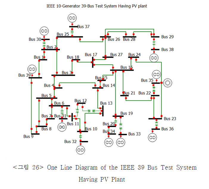 - 앞서 제안한 예측 모델로 특정 날의 출력을 예측했으며, 예측값을 활용하여 IEEE 39 Bus Test System에서 전체 발전 설비 용량의 10% 크기를 가진 태양광 발전 설비가 추가된 계통을 분석하였다.