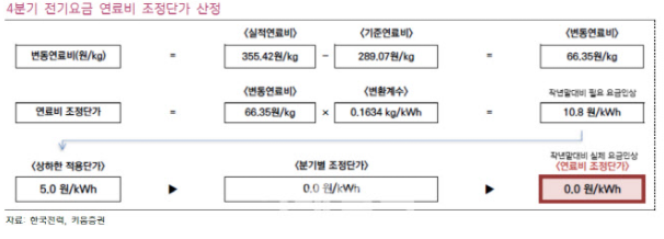 - 이 연구원은 “아직까지 올 3분기 누적기준 연료비 상승요인 10.8원/kWh을 반영하고 있지 못한 상황”이라며 “전기 요금 인상은 긍정적이나 추가 요금인상 또는 연료비 하락이 필요하다”고 짚었다. 이어 “지난해 말 정부가 발표한 전기요금 개편안 이후 첫 요금인상은 주가나 실적 측면에서 긍정적”이라며 “다만 4분기 요금인상에도 여전히 아직 반영하지 못한 10.8원/kWh의 연료비 인상요인이 남아 있고, 최근까지 석탄가격과 유가 상승에 따라 4분기에도 추가 연료비 상승요인이 발생하고 있어 한국전력의 실적 정상화를 위해서는 앞으로도 몇 차례의 더 요금인상이 필요한 상황”이라고 덧붙였다.