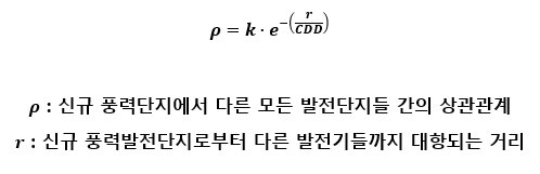 - CDD는 출력을 알고자하는 신규 풍력발전단지(목표 풍력발전단지)와 모든 기존의 다른 풍력발전단지들 간의 관계가 1/e로 감쇠되는 곳의 거리로 정의