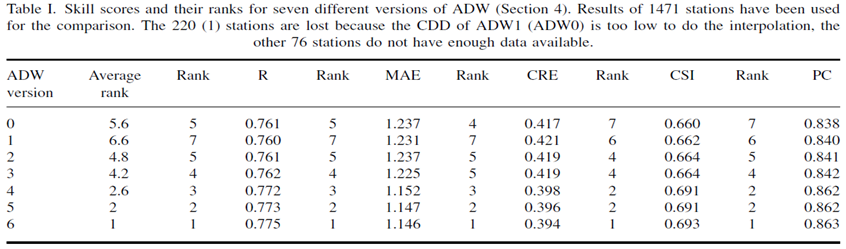 - 내사법 정확도에 대한 일차적 제한은 관측소 네트워크 밀도로 나타난다. 그러나 그 비교에서 ADW4를 사용하면 최상의 성능의 내사법(Global Kriging)에 매우 근접한 보간 기술을 생성할 수 있는 반면에 일정한 CDD는 skill score을 1-5%까지 감소시킨다.