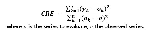 - 측정값과 관측값 사이의 유사성을 측정하는 것이다. 두 변수의 관련성은 평균으로부터의 상대적 이탈, 그리고 두 급수(series)의 평균과 절대적 분산의 측면에서 측정된다. 최상의 경우 0으로 아래 경계를 세우고 위로는 제한을 두지 않는다.