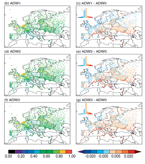 - 따라서, 본 연구는 가변 CDD를 사용하여 ADW 보간 기술의 민감도를 시험한다. 연구의 기본 케이스는 250km의 일정한 CDD를 사용한 보간법으로, 유럽 전역의 모든 관측소의 평균이다. (ADW0으로 칭함).