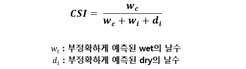 - CSI 또한 정확하게 예측되는 비율이며, 이 경우 wet, dry 각각의 날을 반영하여 이 연구에 적합하다.