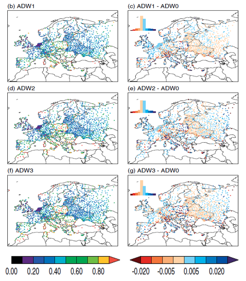 - 관측소 네트워크가 희박한 지역에서는, 차이가 덜 일관적이며, 여기서 ADW0은 일부 관측소에서 더 나은 skill을 보여준다.